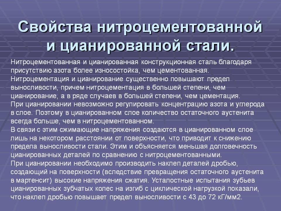 Цианирование выполняется на сталях различных марок, в том числе и на нержавейке. В зависимости от температурного режима, который соблюдался во время самой процедуры, улучшаются прочностные и эксплуатационные характеристики деталей. В зависимости от целей могут подбираться способы цианирования, а также состав смесей. Неправильный подбор технологии может стать причиной изменений отдельных характеристик в худшую сторону.