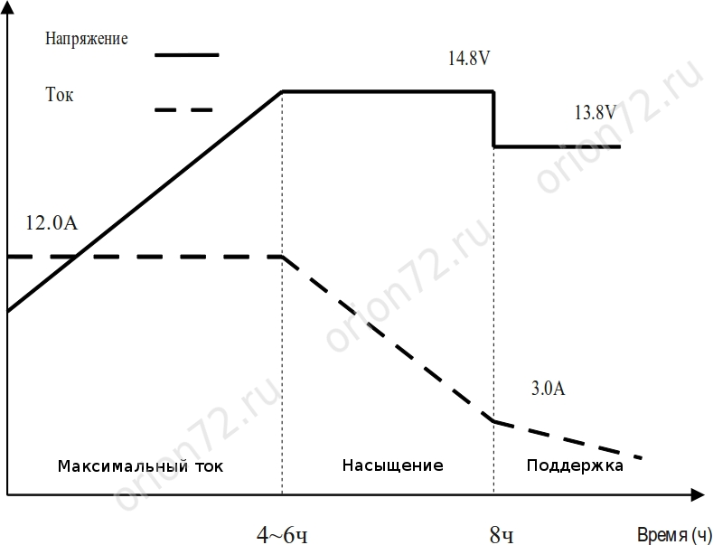 Фаза поддержания заряда: Зарядное устройство подает только несколько миллиампер, необходимых аккумулятору для поддержания полного заряда. Этот малый плавающий ток предотвращает саморазряд батареи.