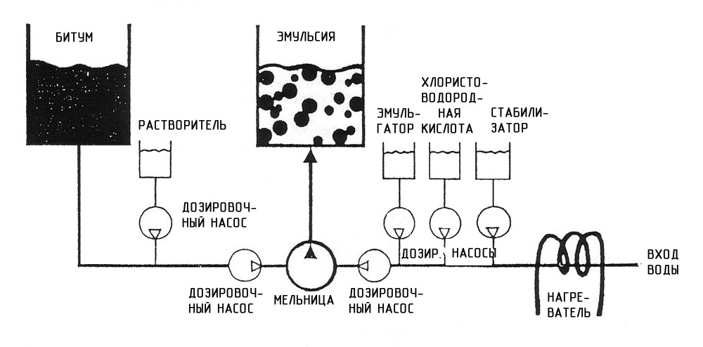 Принцип действия эмульсионных установок основан на доведении воды до нужного уровня кислотности, после чего полученную жидкость смешивают с эмульгатором и адгезионными присадками в определённой пропорции, тем самым получая купаж нужного рецепта. Далее купаж смешивается с битумом при помощи коллоидной мельницы (диспергатора).