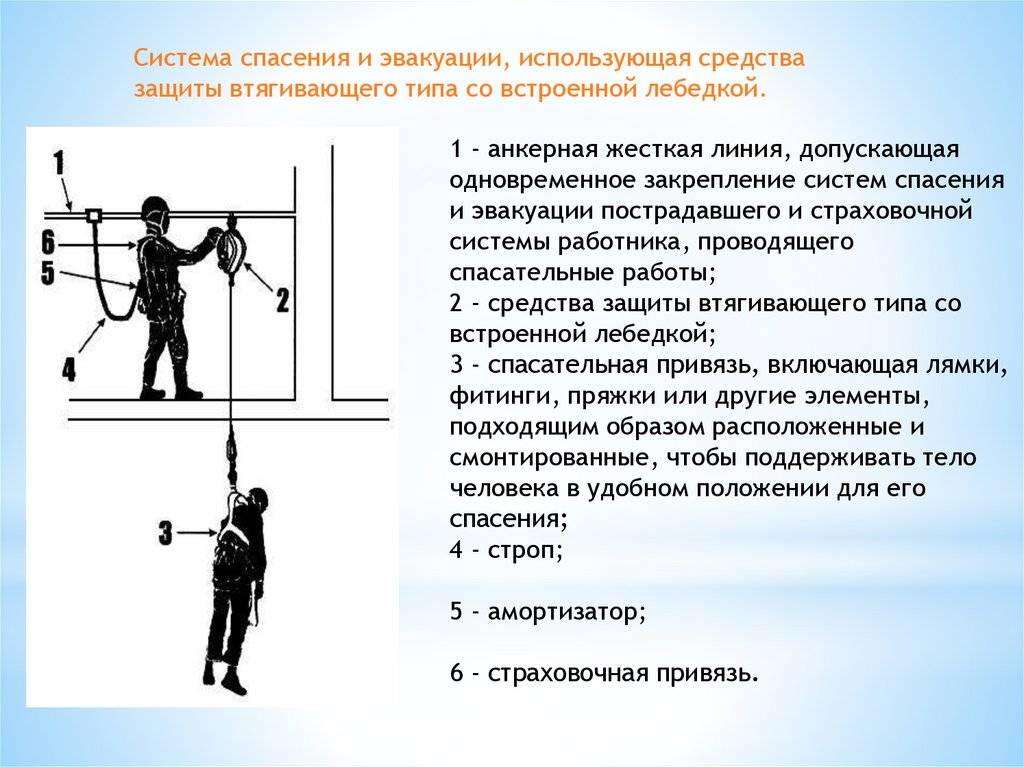 Состав страховочной системы наглядно: 1 — структурные анкера на каждом конце линии, 2 — гибкая анкерная линия, 3 — страховочный строп, 4 — амортизатор страховочного стропа, 5 — привязь