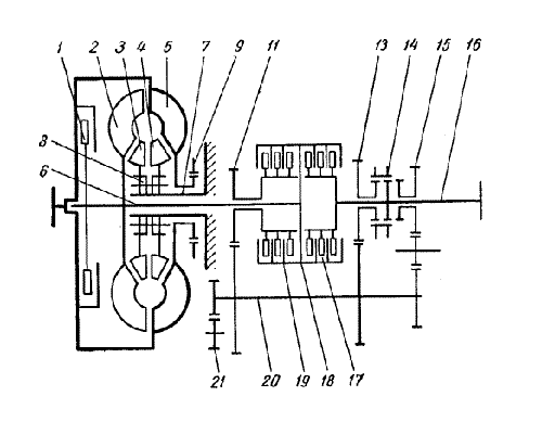 Однако диапазон такого изменения достаточно небольшой, и при этом отсутствует возможность, используя гидромеханический привод, разорвать связь между трансмиссией и мотором, поэтому гидротрансформатор работает последовательно с планетарной коробкой, позволяющей устранить отмеченные недостатки.