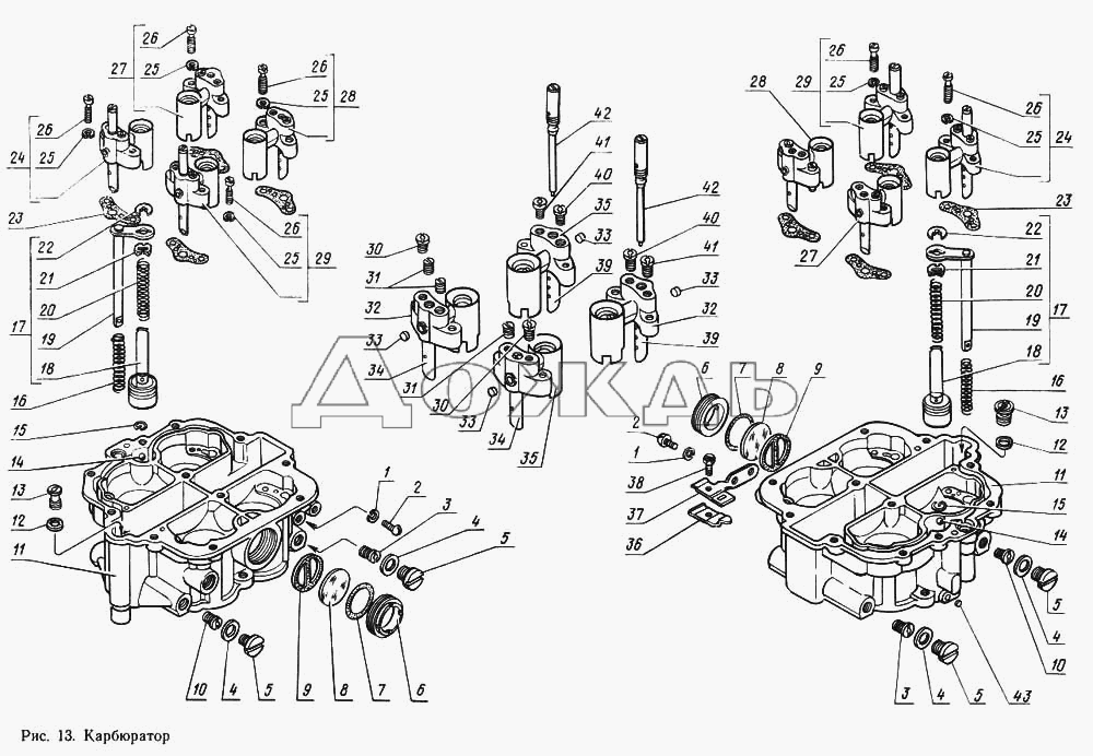В средней части находится поплавковая камера; смотровое окно 30 для наблюдения за уровнем топлива; сливная пробка 31 для слива топлива и отстоя; две смесительные камеры, в каждой из которых установлены малый 8 и большой 17 сдвоенные диффузоры, распылители 7 главной дозирующей системы, включающей воздушный жиклер 6, главный топливный жиклер 44 и эмульсионный колодец с эмульсионной трубкой 46; топливный 9 и воздушный 16 жиклеры холостого хода; клапан экономайзера 56 с пружиной 55, штоком 1 и жиклером-распылителем 13; колодец и поршень ускорительного насоса со штоком 3 и обратным шариковым клапаном 54; вильчатый рычаг 4 с роликом и направляющим штоком 2 для привода ускорительного насоса и экономайзера; нагнетательный клапан 14 и жиклер-распылитель ускорительного насоса.