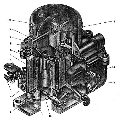 Нагнетательный клапан 14 и воздух, проходящий через отверстие в верхней части распылителя, предотвращает подсос топлива при постоянно открытой дроссельной заслонке и работающем двигателе.