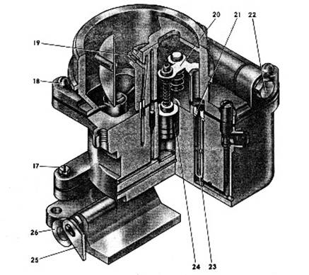 Когда частота вращения коленчатого вала превысит допустимую, под действием центробежной силы клапан 22, преодолевая сопротивление пружины 24, закроется и воздух не может пройти в наддиафрагменную полость. Там создается разрежение, а под диафрагмой сохраняется атмосферное давление. Из-за разности давлений диафрагма прогибается и через рычаг поворачивает ось 38 вместе с дроссельными заслонками в сторону уменьшения подачи горючей смеси в цилиндры двигателя, что и вызывает уменьшение частоты вращения коленчатого вала двигателя. Центробежная сила ротора уменьшается, пружина 24 снова откроет клапан 22 и воздух опять проходит в наддиафрагменную полость.