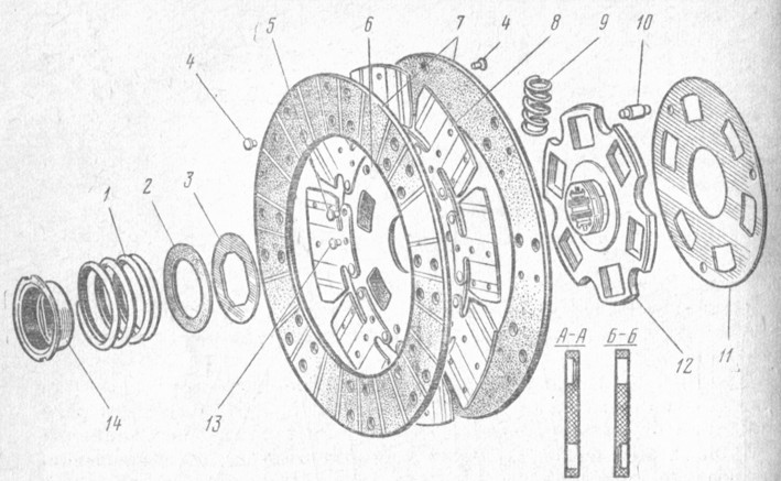 Диск сцепления собран непосредственно из самого диска с пружинными пластинами, а также двух износостойких накладок, которые соединены с ним независимо друг от друга с помощью заклёпок или специального клея. Такая конструкция обеспечивает расхождение накладок при отключенном сцеплении, а при включении — эти пластины сожмутся, что обеспечит плавность движения автомобиля.