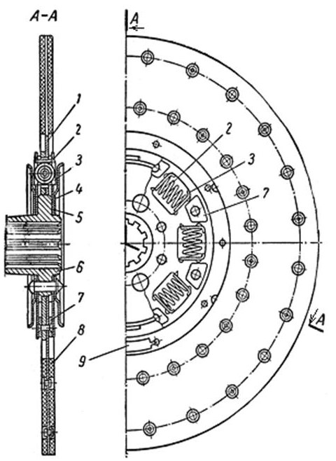 Пластинчатые пружины обеспечивают плавное трогание автомобиля с места посредством постепенного распрямления, которое является следствием увеличения воздействия на диск.