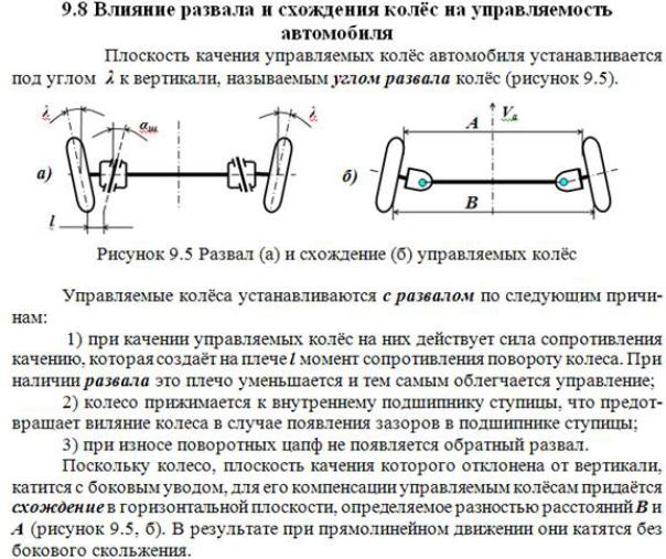 Напомним, что под «развалом» подразумевается угол между вертикалью и плоскостью вращения колеса. А под «схожденим» — угол между направлением движения и плоскостью вращения колеса. Если все это не отрегулировано должным образом, то у автомобиля будут проблемы с управляемостью, в том числе и потеря направления движения.