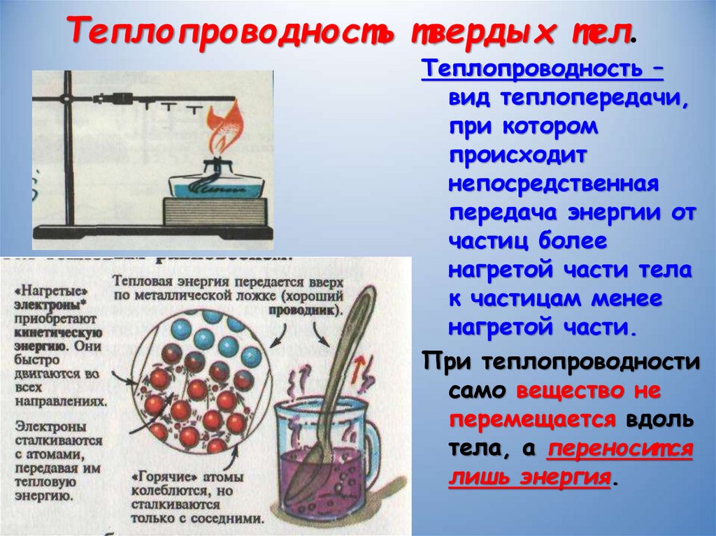При теплопроводности тепло передается между веществами, которые находятся в непосредственном контакте друг с другом.