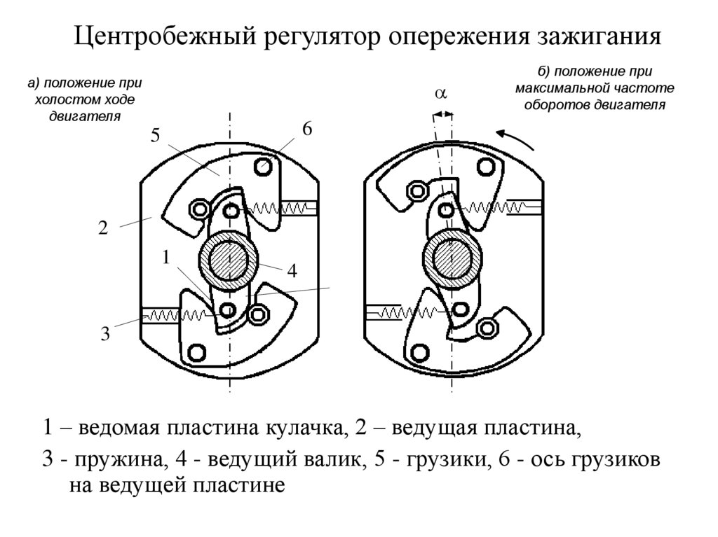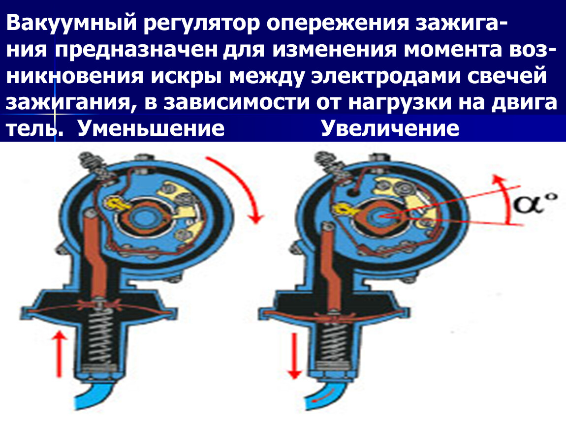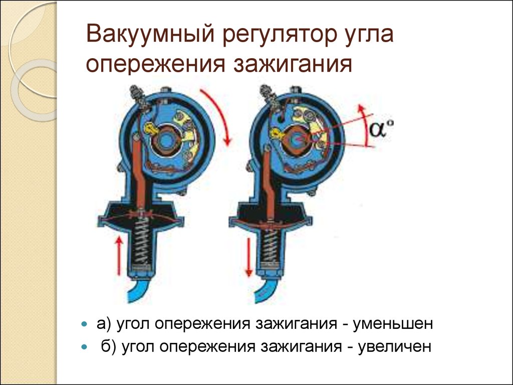 Детонация — уже нехорошо. Это на инжекторном происходят детонации. пока датчик не отработает, так у него есть задержка. А на карбюраторном все регулируется углом опережения: как грузиками, так и вакуумным регулятором. Вакуумный не регулируется и отвечает за опережение зажигания на фиксиррованный угол. А вот два грузика — один с пружиной с большим количеством витков (слабая) отвечает за опережение до 1250 оборотов в мин, другой, с пружиной более жесткой — после 1250 об /мин.