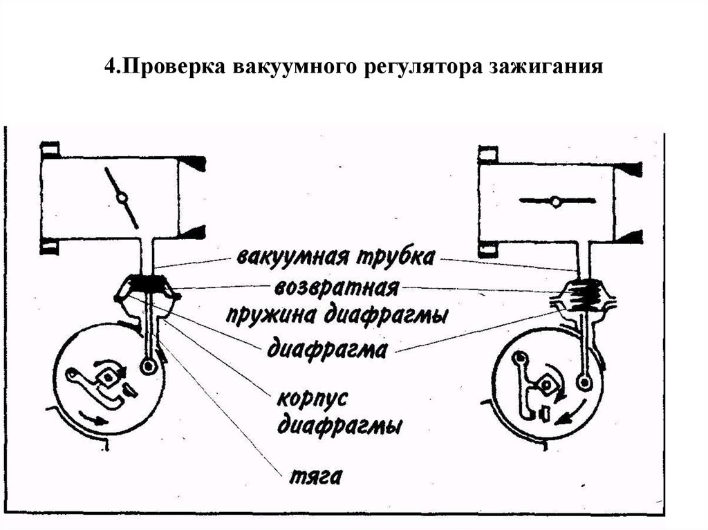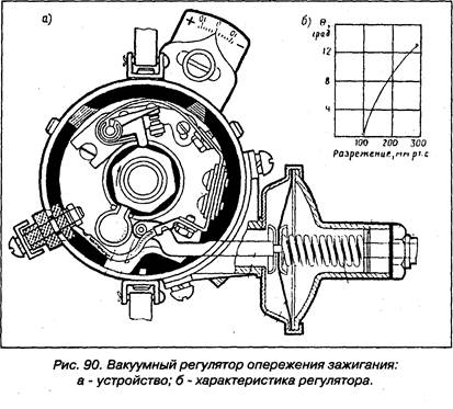 Вакуумный регулятор опережения зажигания имеет следующее устройство.
