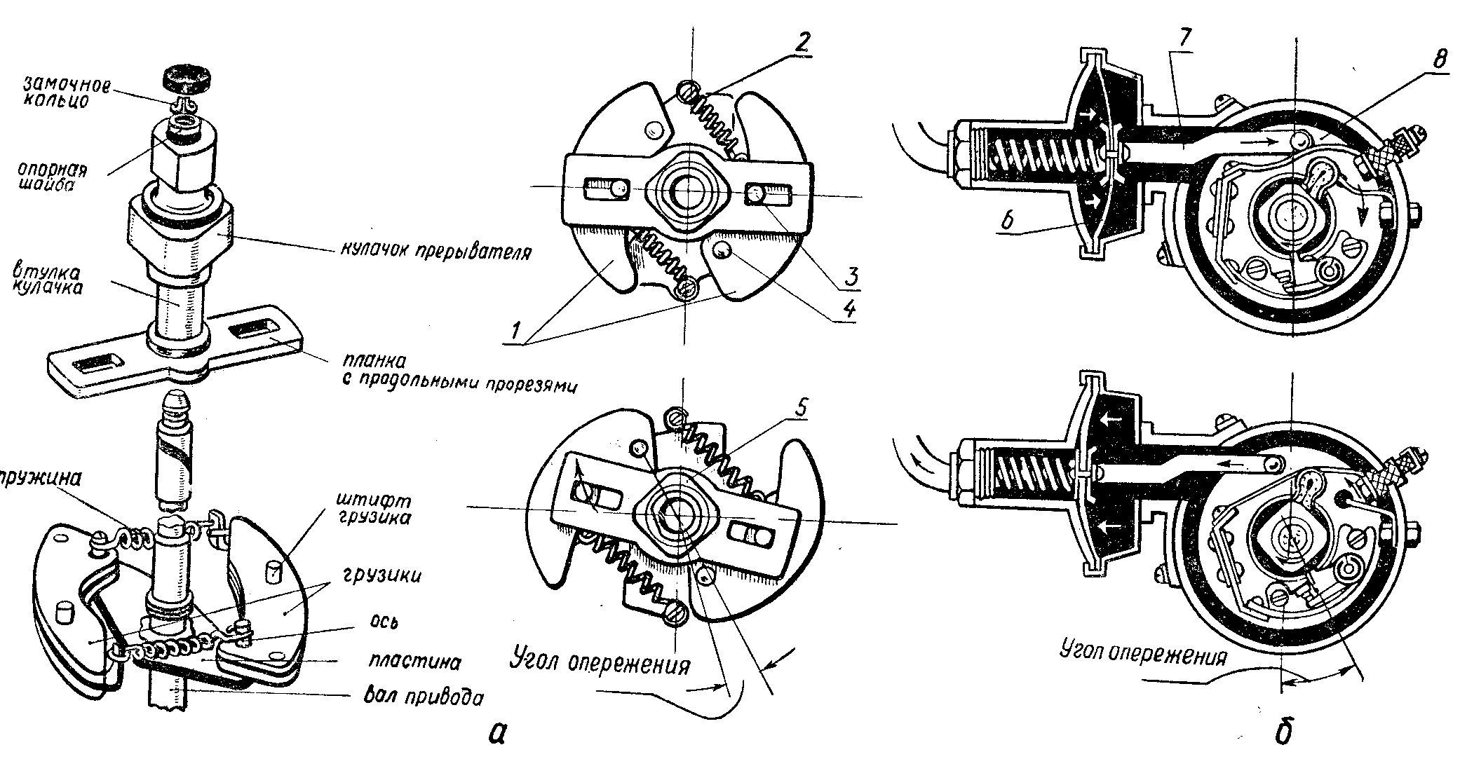Таким образом, на диафрагму воздействует разрежение, зависящее от степени открытия дроссельной заслонки и от нагрузки двигателя. Со стороны распределителя к диафрагме прикреплена тяга 8, связанная шарнирно с подвижной пластиной 10 прерывателя, закрепленной на шарикоподшипнике.