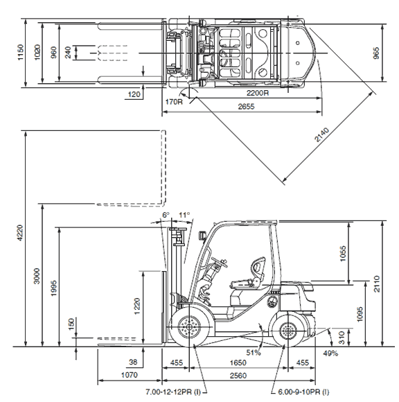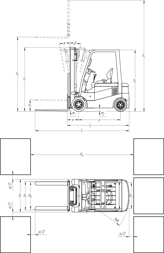 Грузоподъемность погрузчика — 5000 кг. Высокая маневренность позволяет перевозить грузы такой массы по территории шириной немного большей 2 м.