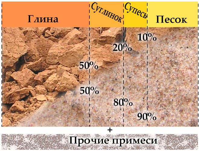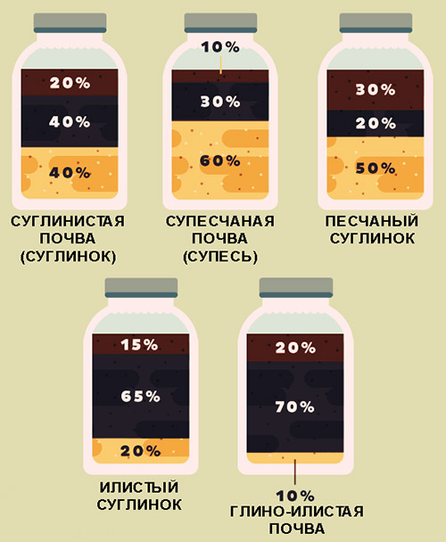 Песчаные почвы содержат тяжелые частицы, которые оседают на дно контейнера толстым слоем и оставляют воду почти полностью прозрачной. И глинистые, и илистые почвы имеют противоположный эффект, оставляя мутную воду с тонким слоем остатков на дне контейнера. Суглинистые почвы также оставят тонкий слой частиц на дне контейнера в дополнение к слою очень легких частиц на поверхности, и вода будет в основном прозрачной, но лишь немного мутной.