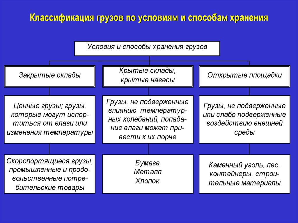 В зависимости от условий хранения и перевозок грузы могут быть обычными и специфическими. К обычным относятся грузы для транспортировки, погрузочно-разгрузочных операций и складирования которых не нужны особые условия.