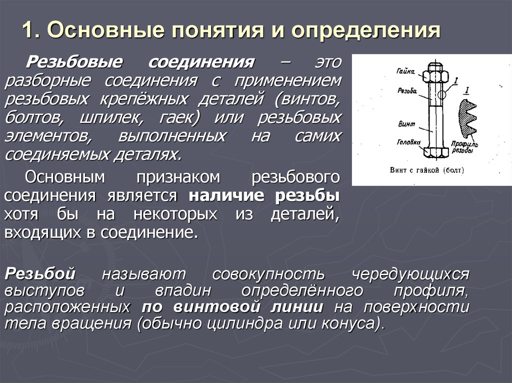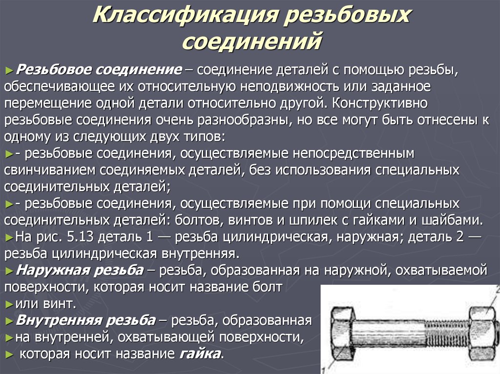 Существует ряд определенных параметров, которые определяют характерные виды резьбы: коническая или цилиндрическая (форма), внутренние и наружные (где расположена резьба), правая или левая (в какую сторону направлены витки).