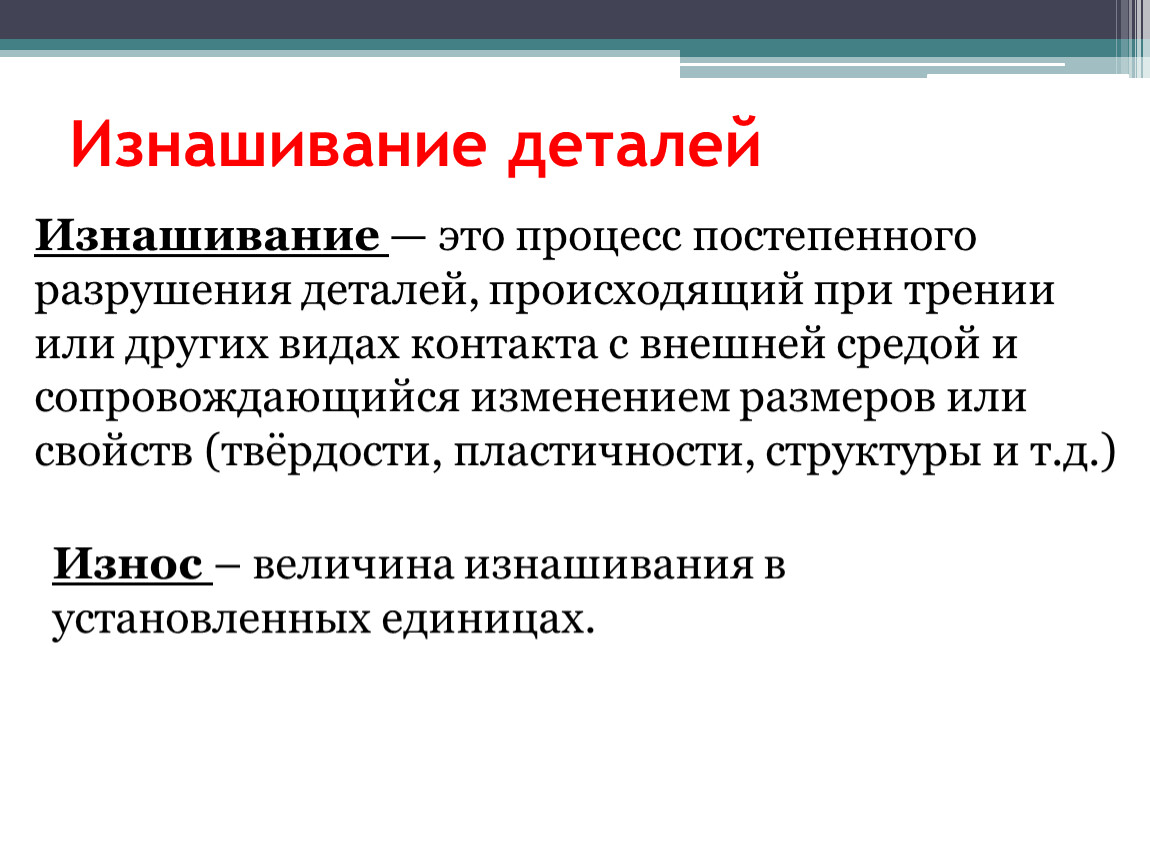 На величину и характер износа и процесс изнашивания влияют много факторов: химико-физические свойства материала деталей, качество трущихся поверхностей, величина удельного давления и скорость относительного перемещения, температура деталей, и также качество и количество смазки и способ ее подвода.