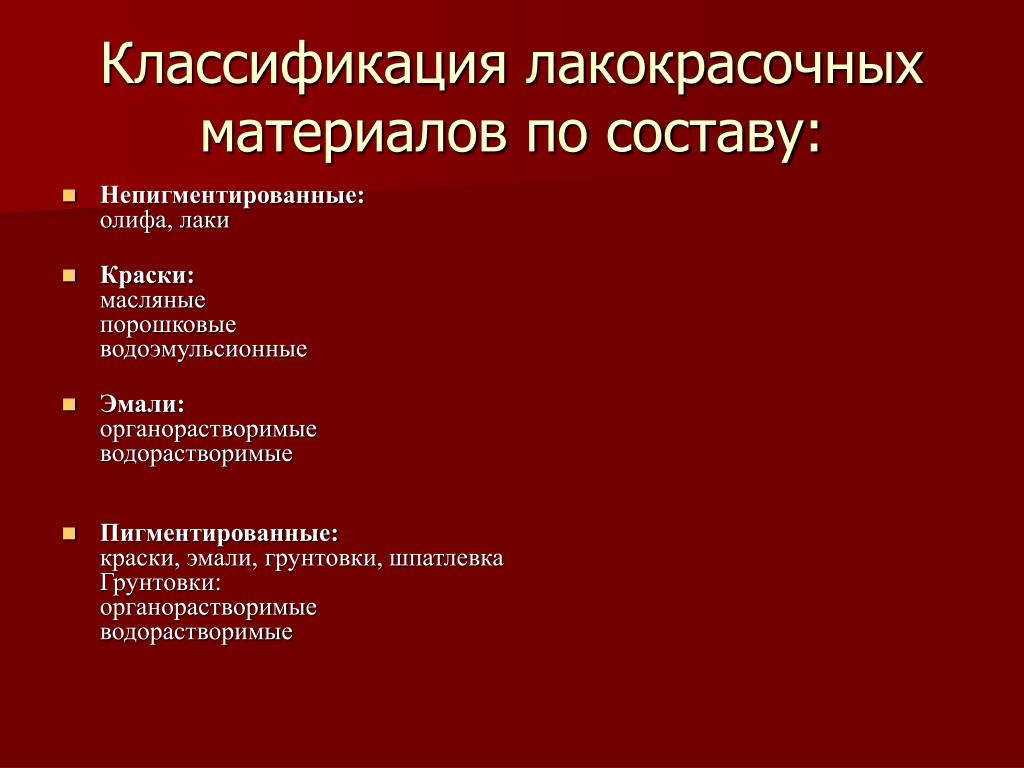В независимости от типа и вида, лакокрасочные изделия представляют состав, в котором присутствуют: связывающее вещество, наполнитель, пигмент и самые различные добавки, позволяющие повышать технологические и эксплуатационные характеристики. Каждая составляющая, выполняет определенные функции. Например: связывающее вещество позволяет сцеплять пленку лакокрасочного материала с поверхностью, наполнитель делает сырье тягучим и гладким при нанесении, а пигменты придают материалу определенный оттенок.