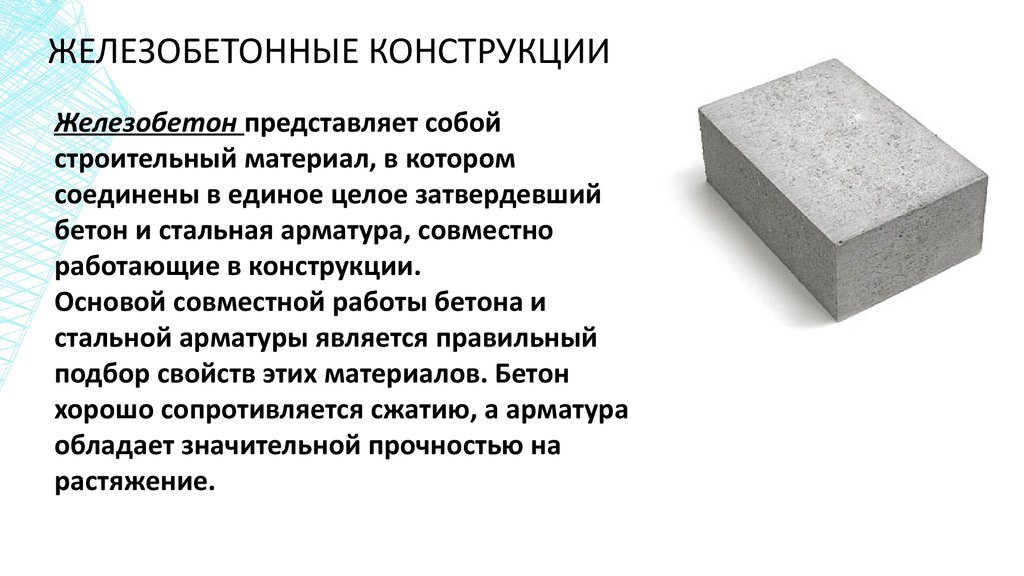 Два материала – бетон и сталь – действуют вместе, противодействуя внешним силам, таким как ветер, вибрации, землетрясения и всем другим причинам растягивающих и сдвигающих напряжений, таким образом предотвращая растрескивание, крошение или полное разрушение бетона.