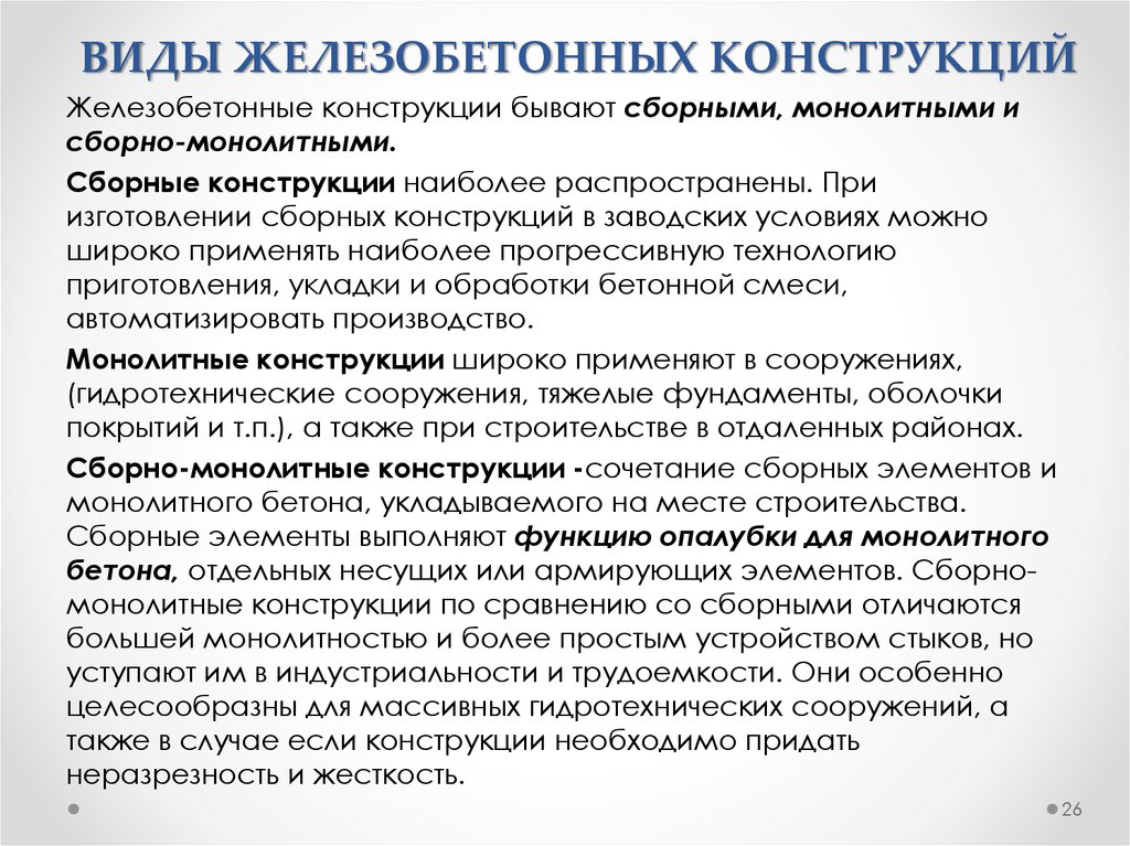 Бетонные и железобетонные конструкции используют в самых разных областях строительства, поэтому они бываю разных видов. В качестве примера мы привели лишь наиболее распространенные типы конструкций. В действительности же их существует гораздо большее количество.