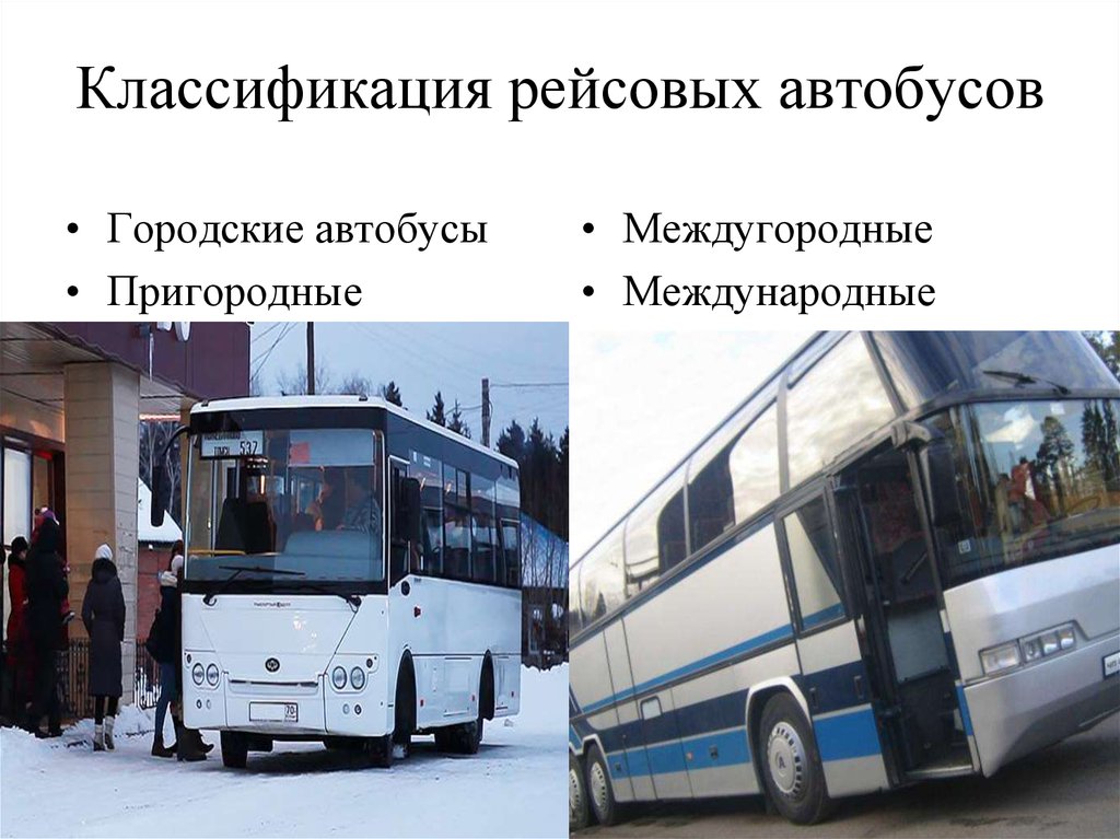 Автобусом называется пассажирский автомобиль, имеющий более девяти мест для сидения. Автобусы классифицируются: