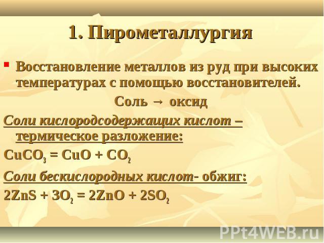 {n+}}$ – ион металла, $\ce{n}$ – количество электронов. Применяется на разных этапах металлургич. произ-ва: при обжиге, плавке, электролизе, цементации, рафинировании и др. В. м. осуществляется: в результате реакций с посторонним восстановителем, при воздействии электрич. тока, разложением (чаще всего термическим) неустойчивых соединений до исходного металла; проводится на воздухе (напр., доменный процесс), в растворе или расплаве (электролиз), в вакууме (рафинирование), инертной атмосфере (металлотермия) и плазме (плазменная плавка).