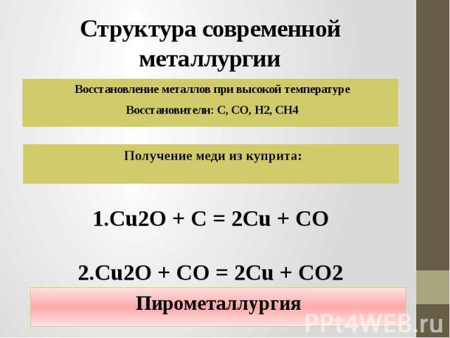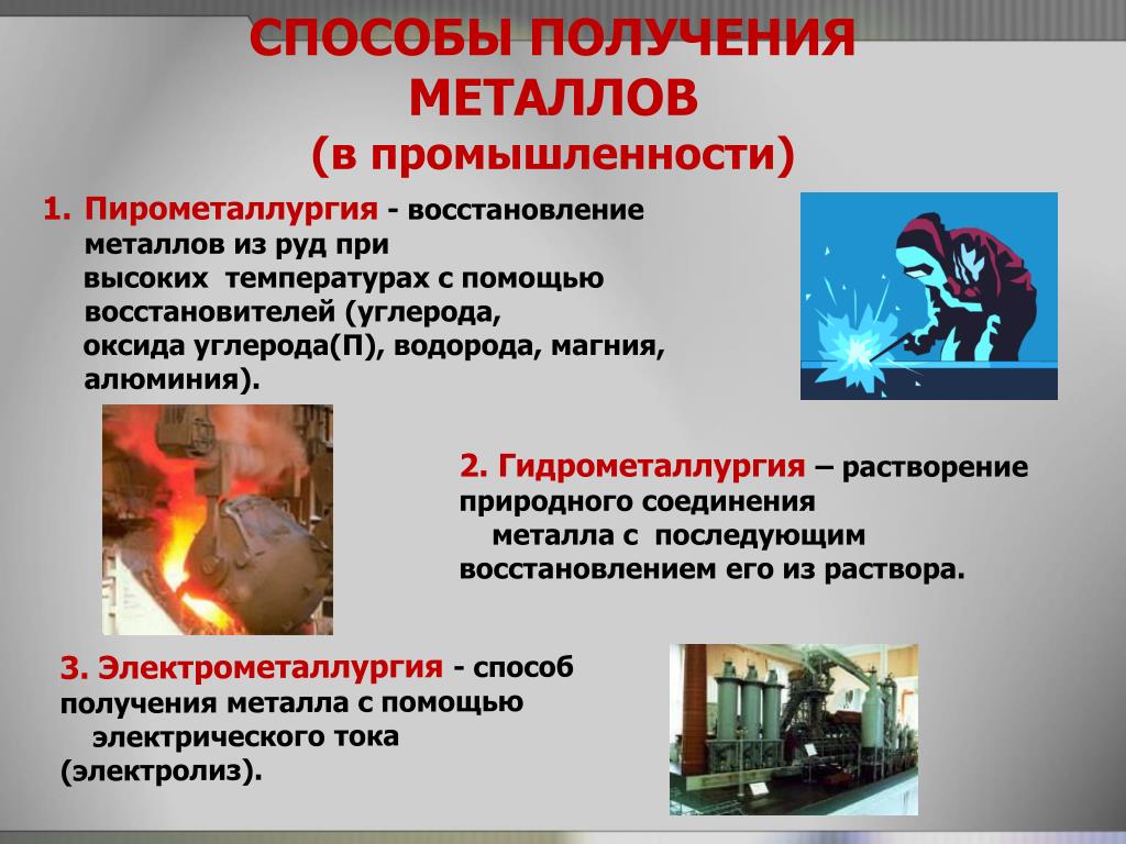 В промышленности редко можно найти чистый металл, в основном применяются сплавы из нескольких элементов. Одна из задач металлургической отрасли получение свободных металлов с помощью восстановления химических соединений.