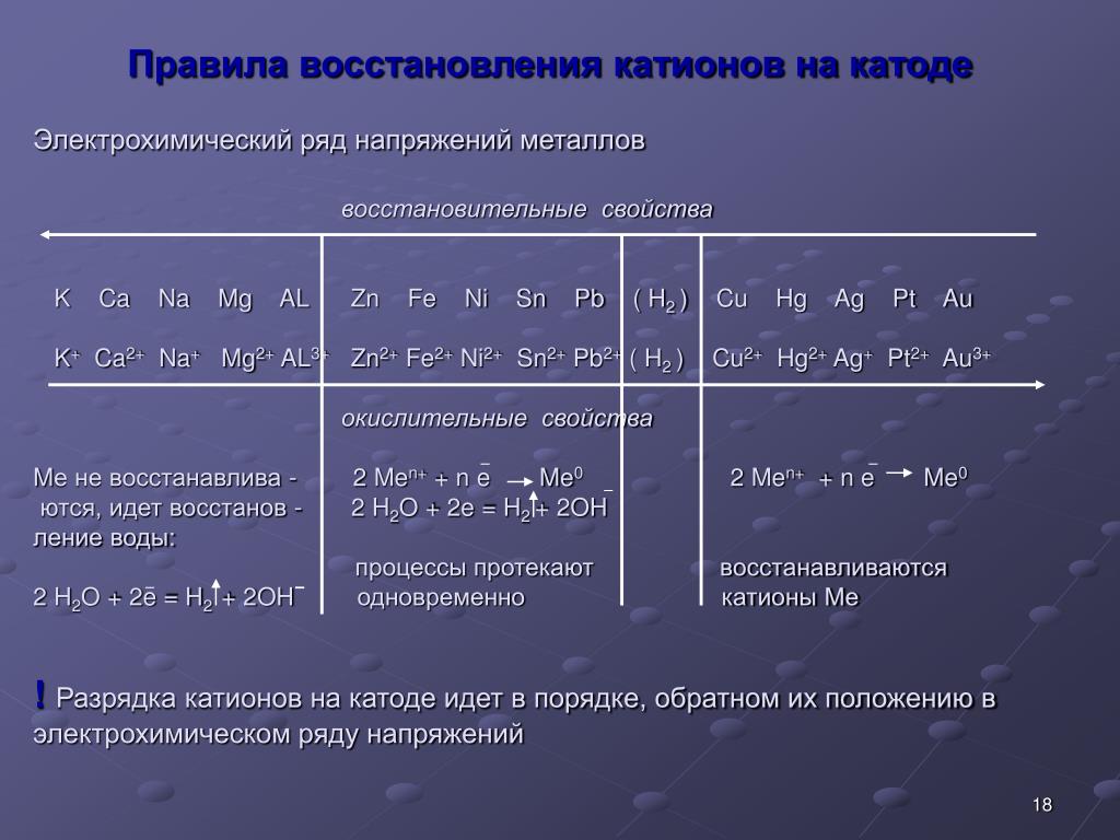 В. м. с использованием электрич. тока применяется в электролизных процессах. Катионы металлов, принимая электроны от катода электрохимич. ячейки, разряжаются до нуль-валентного (т. е. свободного) состояния. Чем более электроположительный металл в ряду напряжений, тем меньшее напряжение прикладывается к электрохимич. ячейке. Элементы, более отрицательные в ряду напряжений, чем водород, получают электролизом расплавов солей, а не водных растворов.