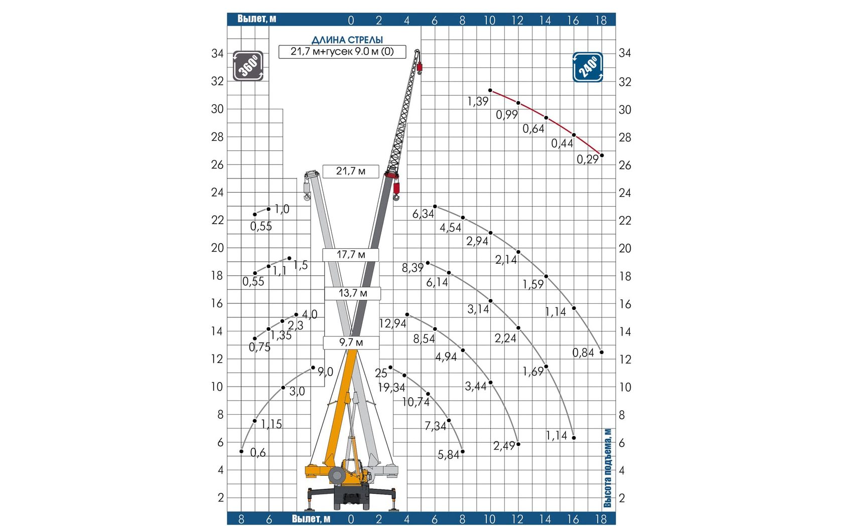 | Высота подъема груза на основной / максимальной стреле, м | 13,7 / 32,3 |
