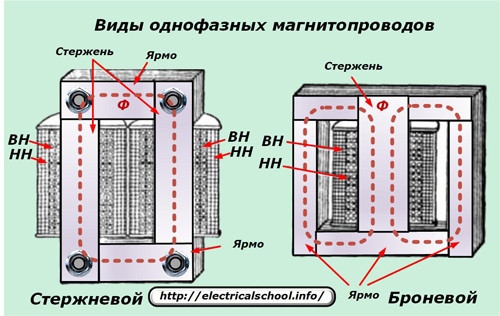 делятся на стержневые и броневые. В стержневых магнитопроводах