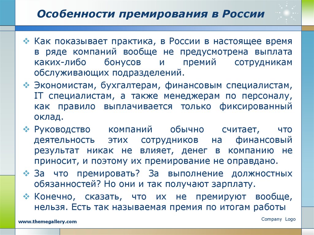 Однако в финансовой структуре предприятия премии часто представляют собой наиболее сумбурную и неструктурированную часть бюджета, вносящую сумятицу в бухгалтерию. Причиной становится плохо прописанная схема премирования, отсутствие четких правил и условий для назначения премий.