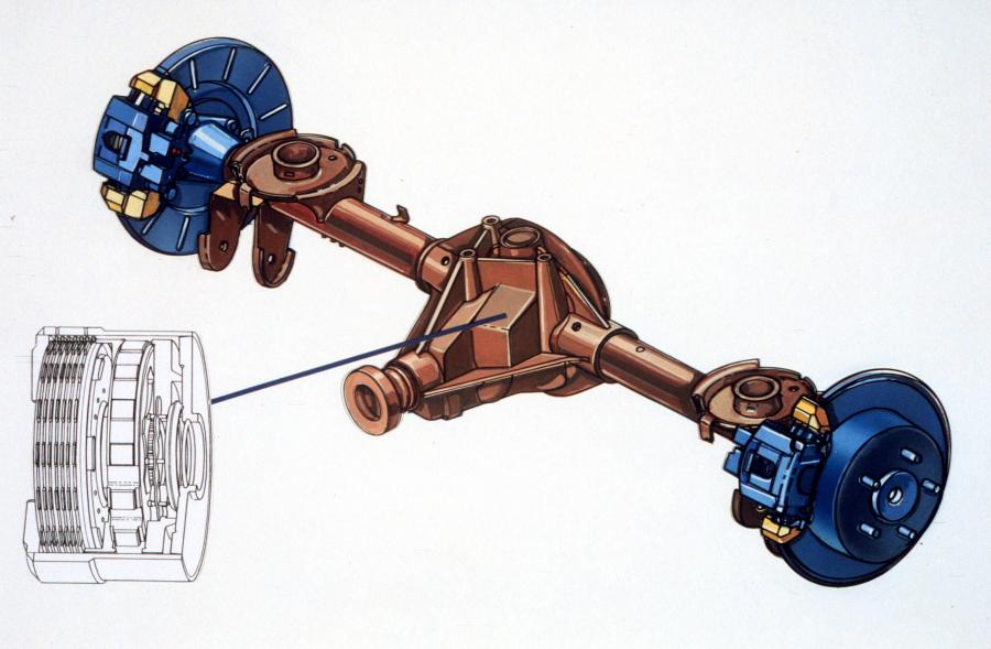Двойная главная передача редуктора моста машины включает в себя две конические шестерни, зубья в которых спиральные, и две цилиндрических шестерни, зубья в них косые. Симметричный дифференциал конического вида с четырьмя сателлитами прикреплен болтами к ведомой шестерне цилиндрической.
