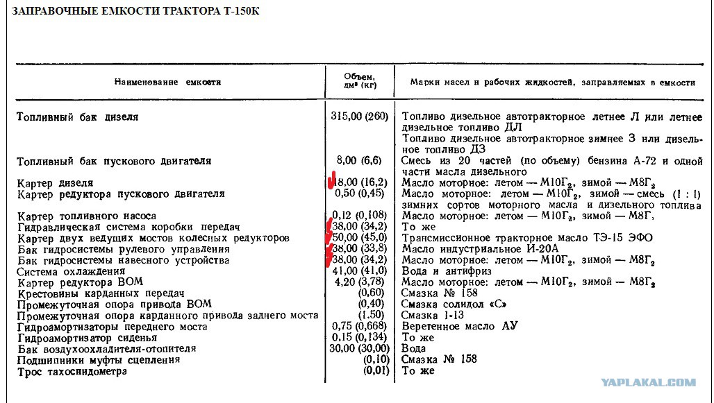 | Основные заправочные ёмкости | Объём, л (марка трактора) | |