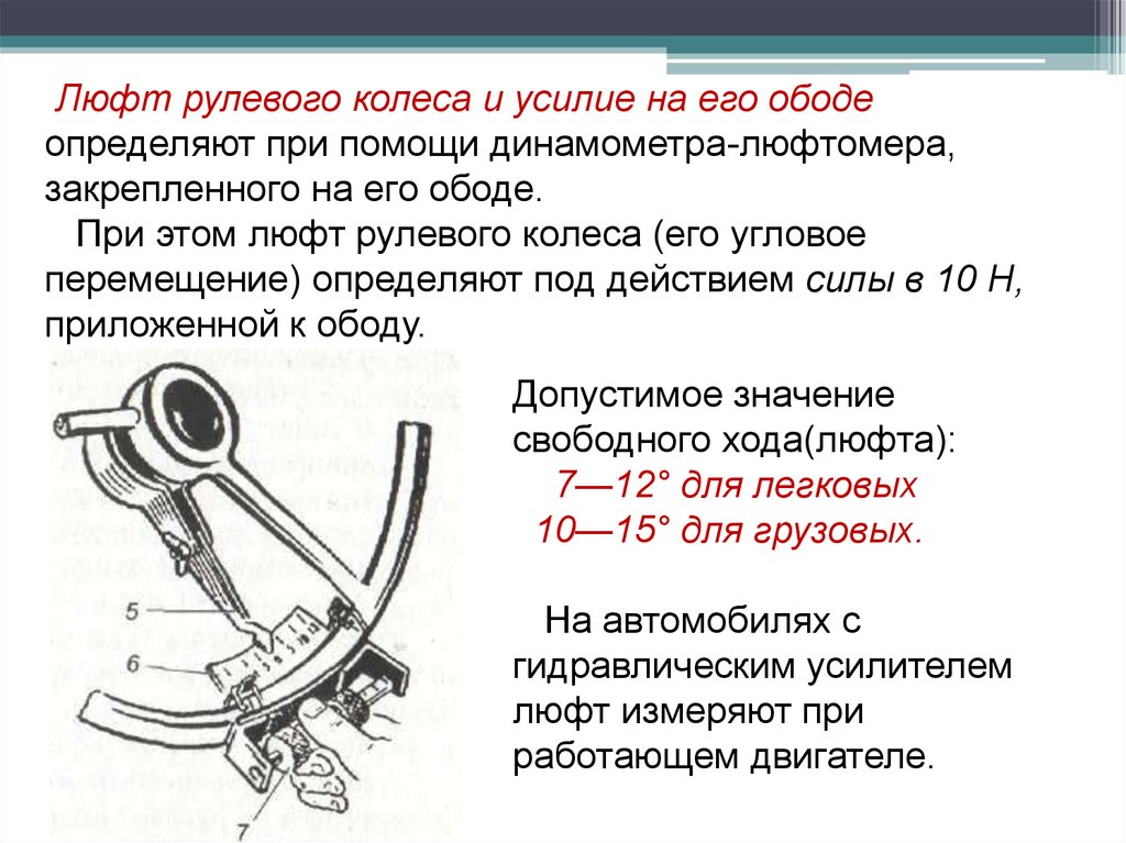 Исправным является рулевой механизм, если при движении по прямой, люфт рулевого колеса не превышает 10 градусов. В случае, если допустимые значения выше, требуется проверить зазор в подшипниках вала винта. Большой зазор в подшипниках характеризуется легко ощутимым осевым люфтом.