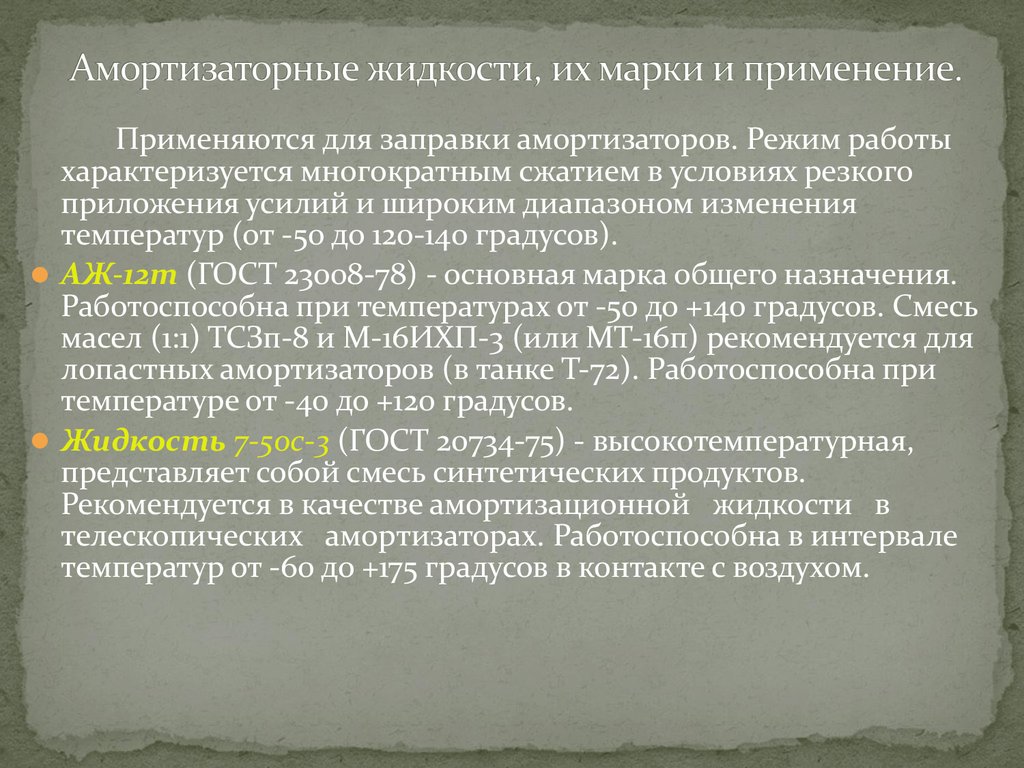 Амортизаторная жидкость АЖ-12М изготовляется на базе минерального масла с добавлением пакета противоизносной, диспергирующей, загущающей, антиокислительной, противопенной присадок.